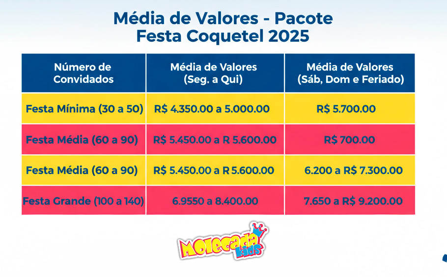 Para ter uma ideia concreta do investimento em uma festa completa e inesquecível no Molecada Kids, confira a faixa de valores para o nosso pacote Festa Coquetel 2025.