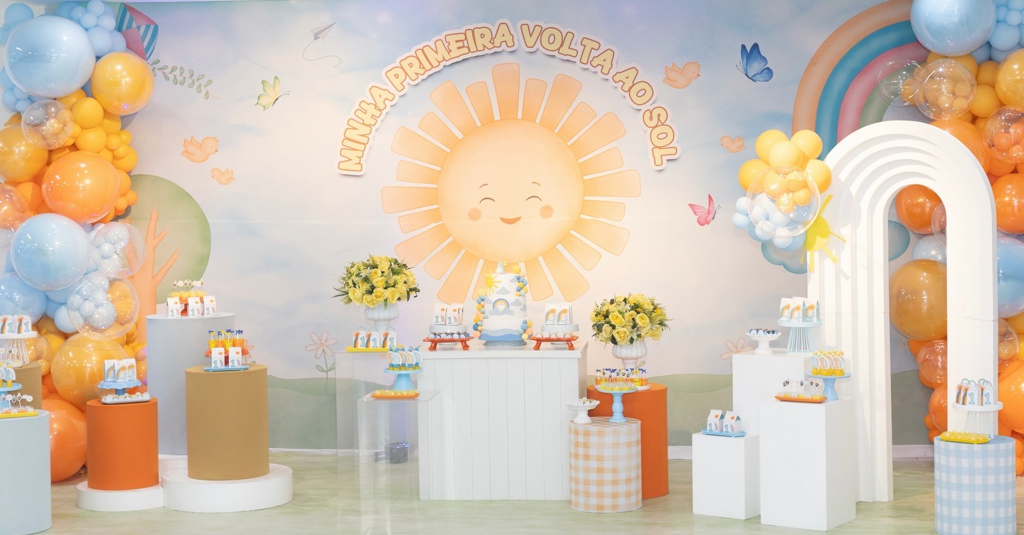 O marco do primeiro aninho! O tema Primeira Volta ao Sol é uma celebração poética da vida do seu bebê. O Molecada Kids oferece uma decoração de festa infantil em BH suave, com sol, nuvens e balões. Nosso buffet infantil em Belo Horizonte é ideal para esse momento especial, com muito carinho e conforto para toda a família.